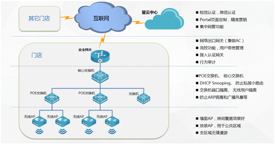面对移动互联网大潮对传统行业的冲击,运用云计算、移动社交、大数据分析等技术,为酒店、餐饮、休闲娱乐、零售商超等商业市场客户构建基础网络平台,加速商业市场客户业务创新和转型已经刻不容缓,K8凯发(中国)智云商业解决方案志在为商业客户给予最强的用户体验,给予最具商业价值的云网络,给予基于portal认证,短信、微信营销功能。